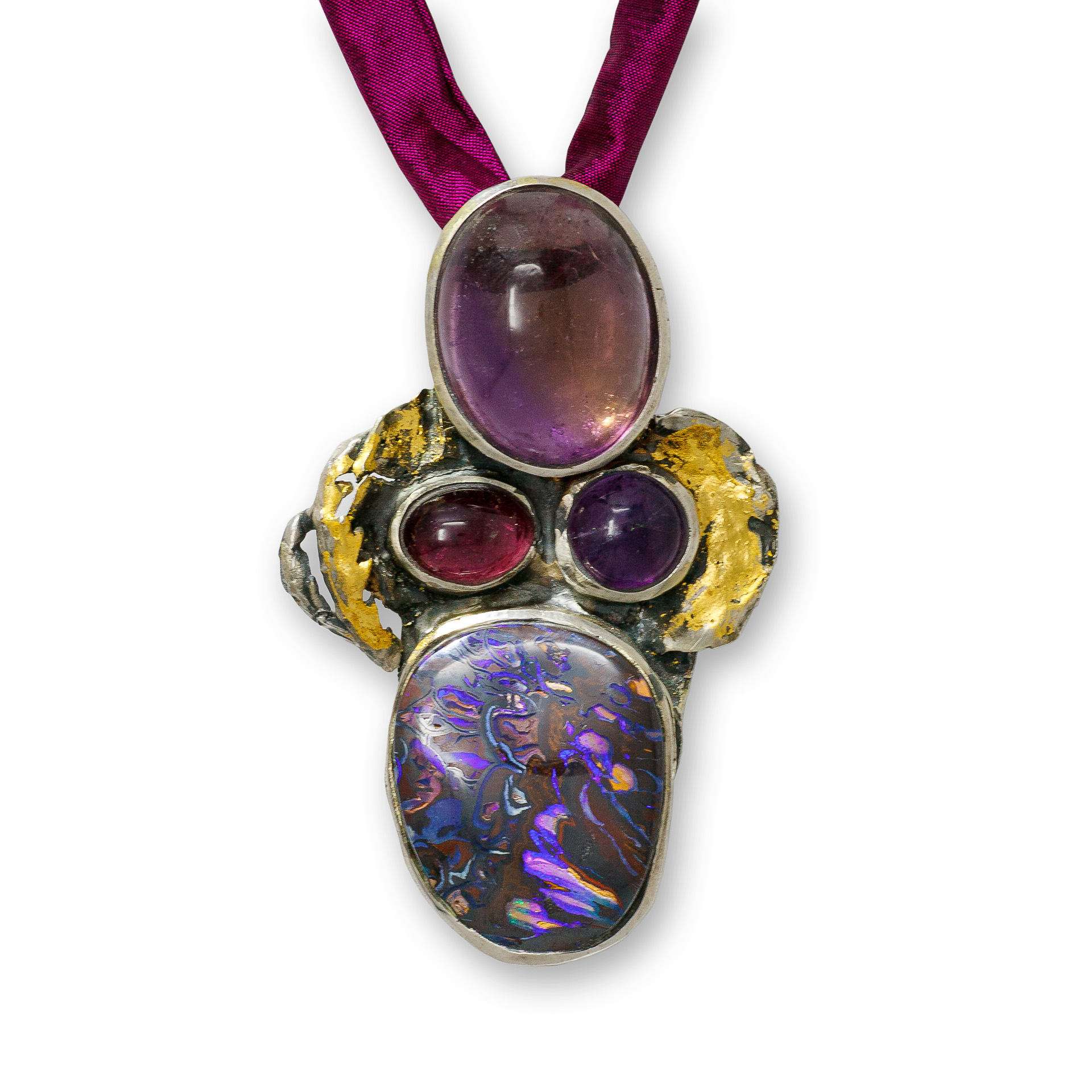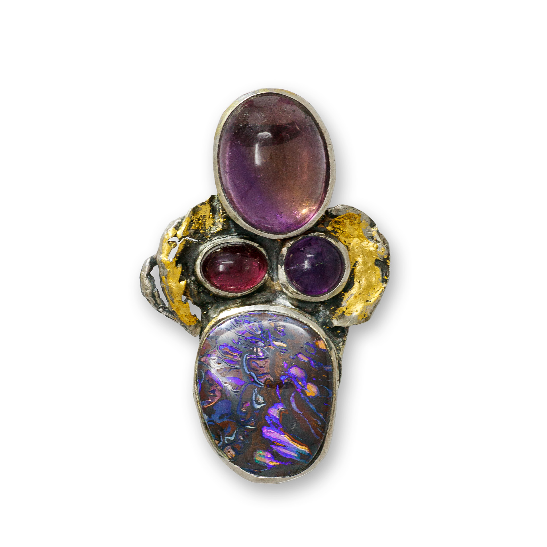 925 silver, patinated gold leaf, ametrine, tourmaline, amethyst, boulder opal